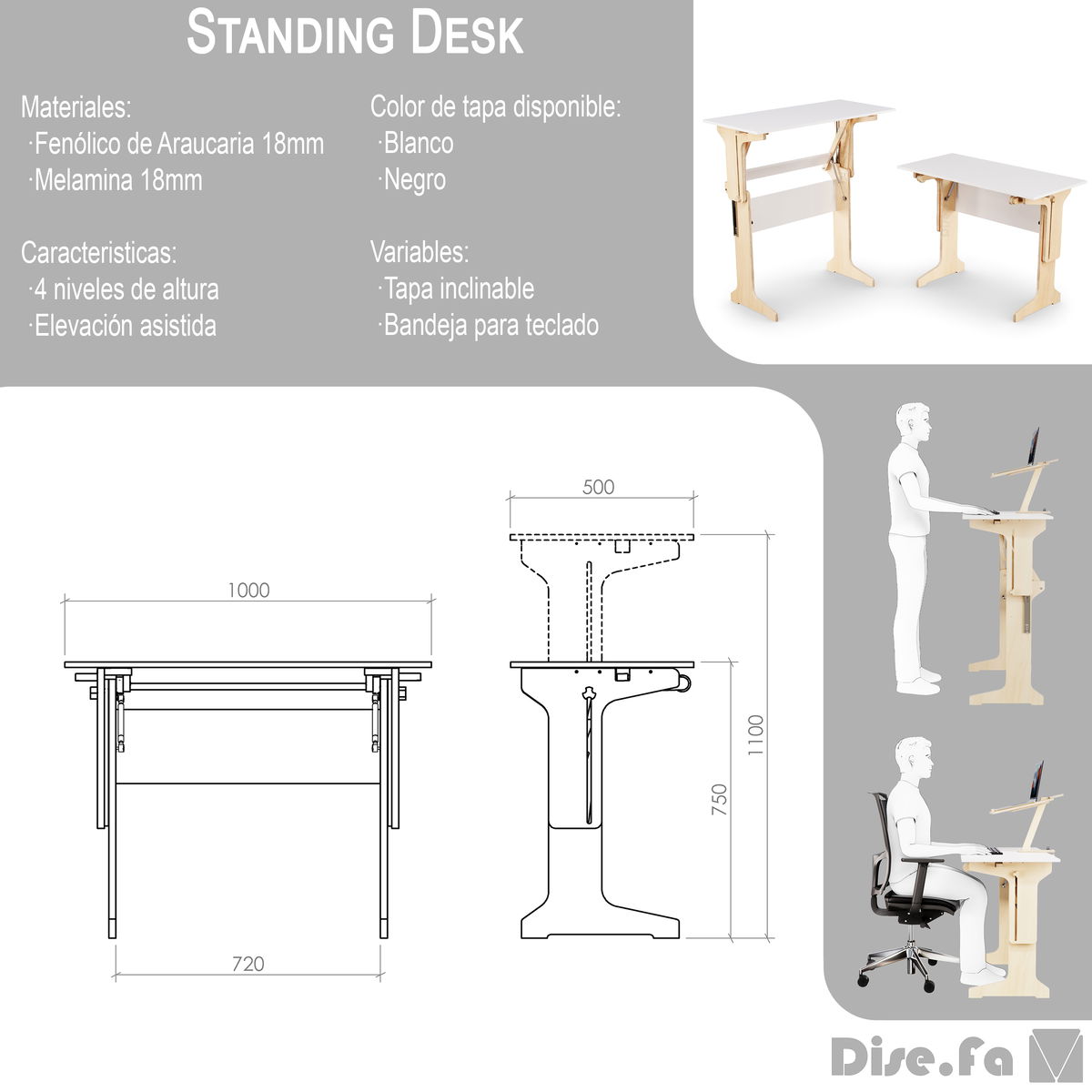 Ofrece un amplio espacio de trabajo y la altura regulable permite adaptarlo a las necesidades de cada usuario, brindando la posibilidad de trabajar de pie o sentado. Elevación asistida con pistones, mecanismo 100% analógico. Brinda versatilidad y funcionalidad a tu espacio.